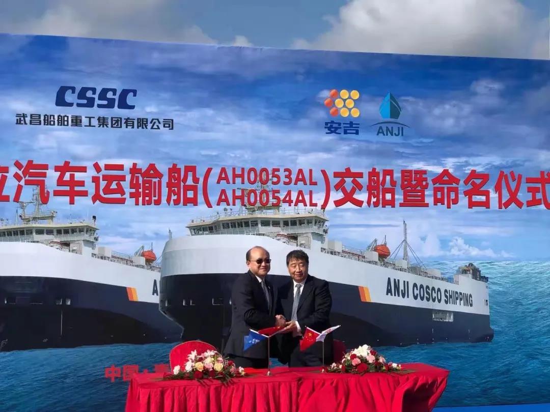 On September 29, two car carriers with 2,200 spaces for domestic trade, Anji 31 and Anji 32, funded and constructed by SAIC Anji Shipping was delivered and named in the second wharf of Qingdao Beihai Shipbuilding Heavy Industry, a subsidiary of Wuchang Shipbuilding Industry. Leaders and distinguished guests are invited to attend the ceremony, including Gu Xiaoqiong (General Financial Manager of SAIC Motor and Director of SAIC Anji Logistics), Wang Zemin (General Manager of SAIC Anji Logistics and director of SAIC Anji Shipping), Xin Jianmin (Vice-general Manager of SAIC Anji Logistics and General Manager of SAIC Anji Shipping), Chen Qing (Secretary of The Party Committee and Director of Wuchang Shipbuilding Industry), Wang Gangyi (Chief Engineer of Shanghai Merchant Ship Design and Research Institute) and representatives of Qingdao CCS and Shuangxi Maritime Affairs.