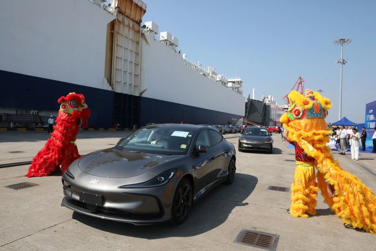 装车仪式上,来自国内多个品牌的商品车整齐排列,有序驶上巨轮,即将开启跨越重洋的旅程。